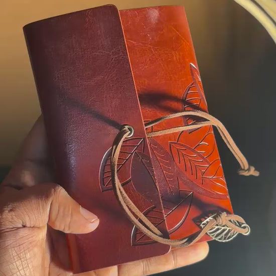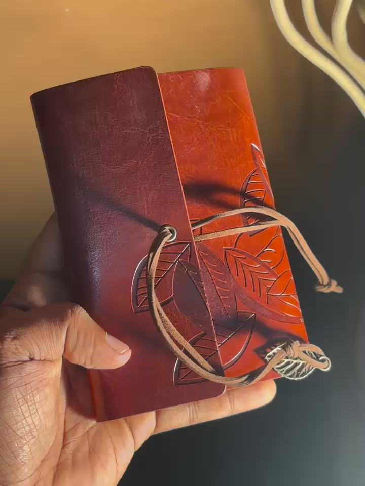 A stylish and compact leather-bound journal with embossed leaf design and vintage wrap cord closure. Features a bronze leaf charm and soft faux leather cover β perfect for gifting, journaling, or travel notes.