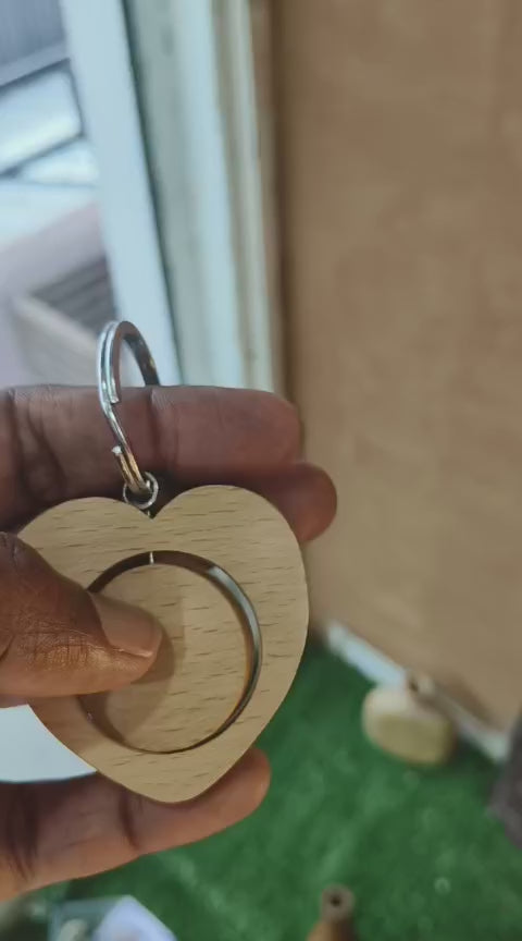 A charming heart-shaped wooden keychain with a revolving center, custom-engraved with your photo. Compact, elegant, and made from smooth natural wood β perfect as a personal keepsake or a thoughtful gift.
